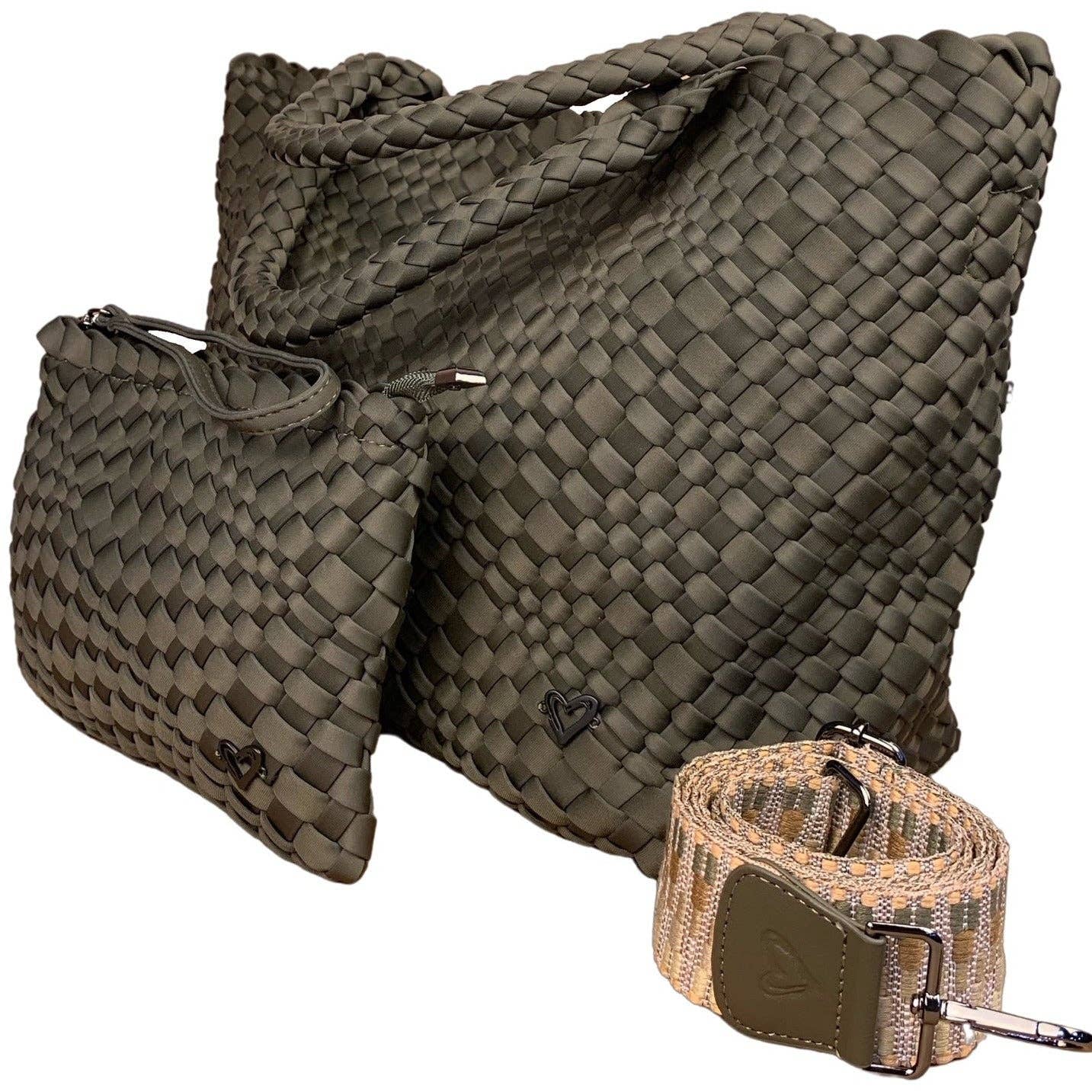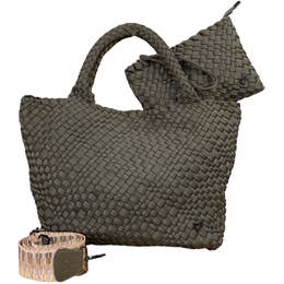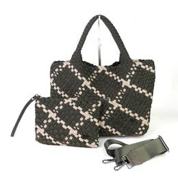 DETAILS: * Made of premium neoprene and every bag is meticulously woven by hand * Matching wristlet pouch with hand-strap, can be clipped inside tote * Hidden magnetic closure at top of tote * Can be used with or without coordinating crossbody strap * Removable base for easy cleaning/washing