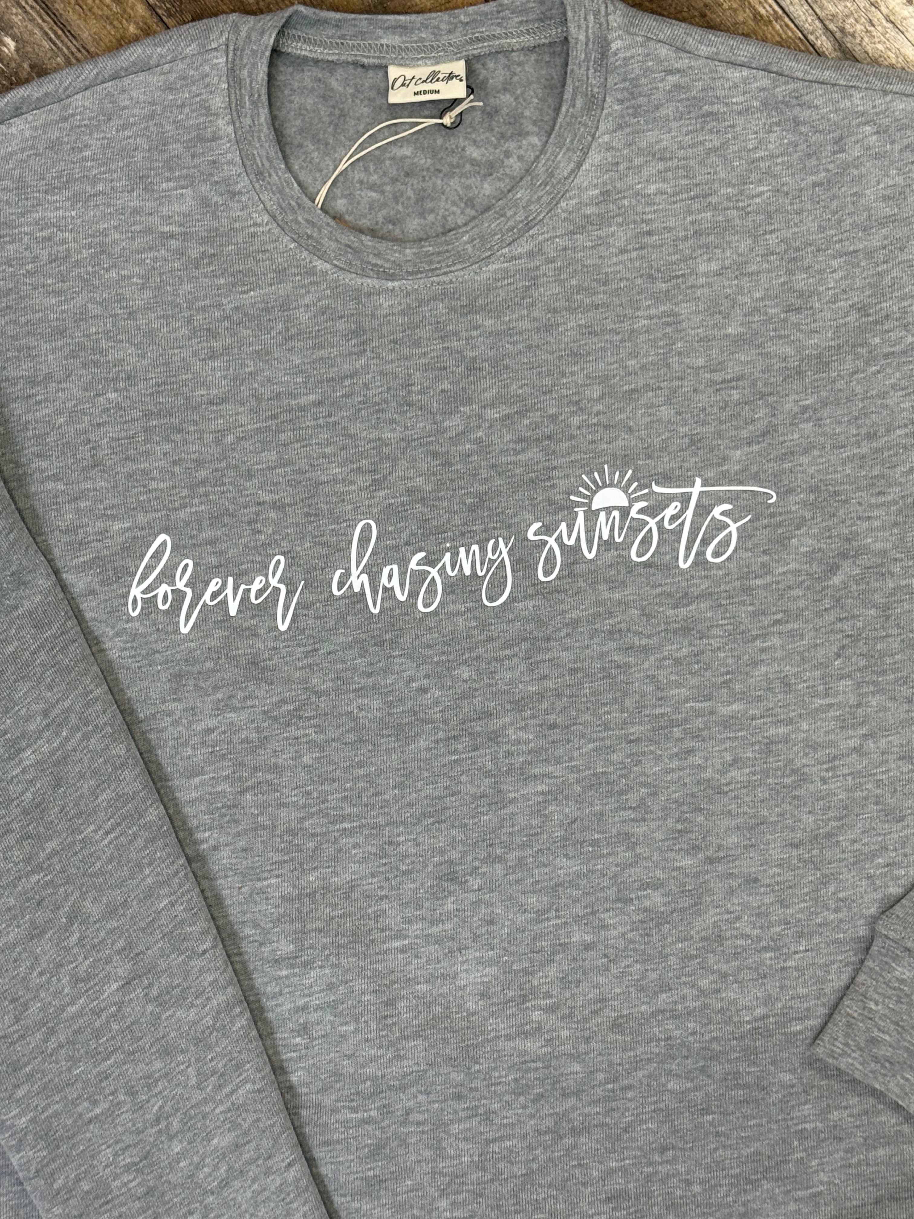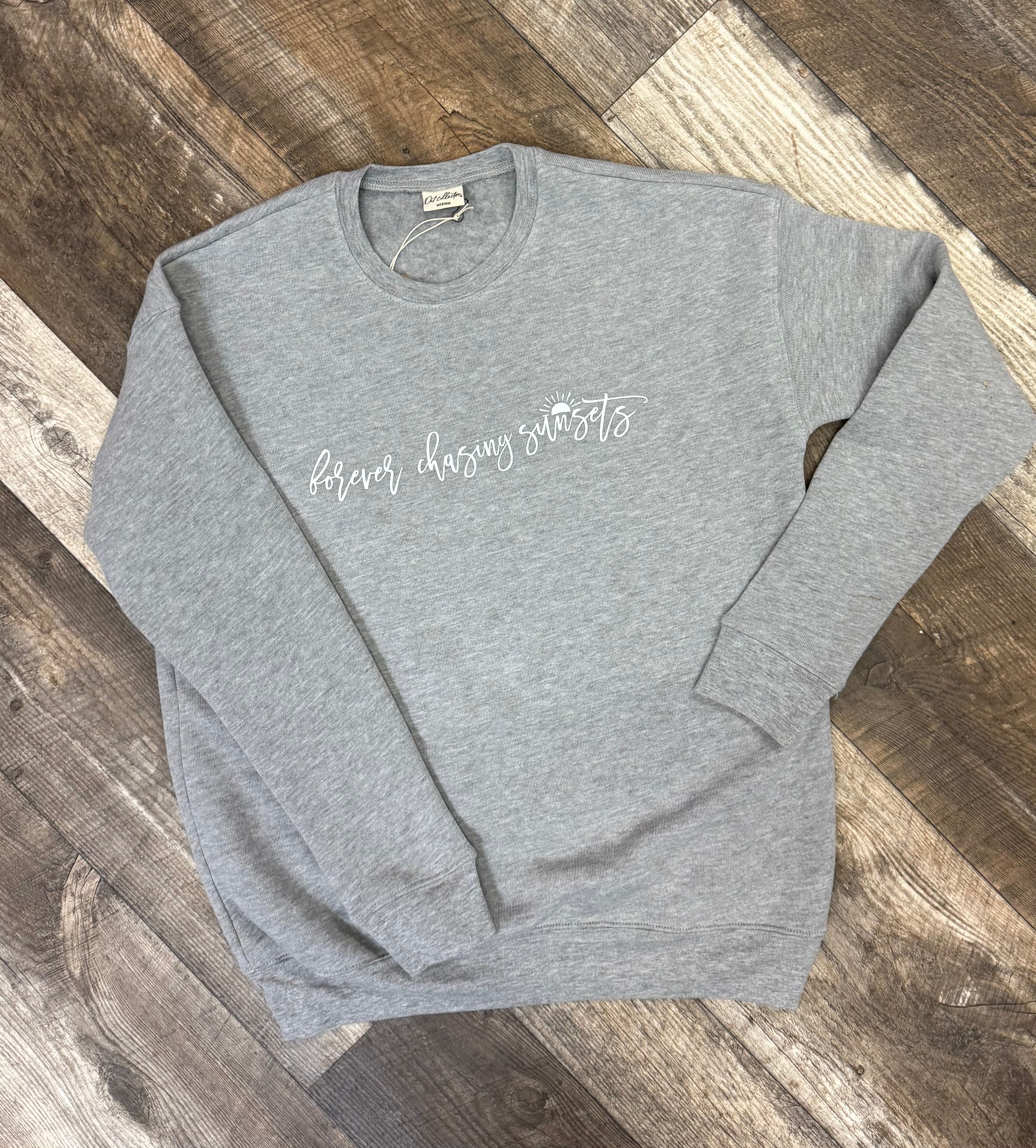 Embrace the endless beauty of twilight with our Forever Chasing Sunsets Graphic. Perfect for anyone who loves adventure and the simple joys of nature, it adds a touch of warmth and wanderlust to your style. Printed on our Oat Collective super soft crewneck or Comfort Colors 100% Cotton in color Granite.