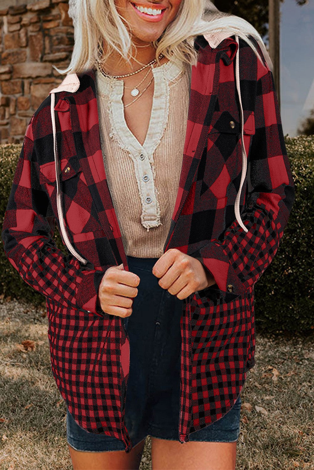 Grab this shacket and wrap yourself in cozy autumn vibes! It has trendy frayed details and classic checked print. A contrast hood with a functional drawstring that buttons on to attach. A relaxed silhouette that ends in an uneven, unfinished hemline.