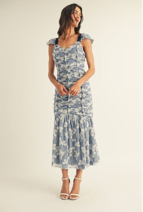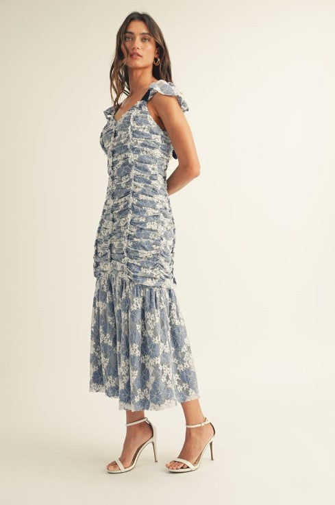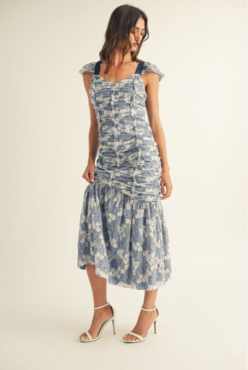 Elegant midi dress crafted from delicate floral lace with a softly ruched bodice that flatters your silhouette. Flutter cap sleeves and adjustable straps frame a sweetheart neckline, while a lace-up ribbon detail adorns the back for added charm and fit customization. The fitted bodice transitions into a gently flared hem with gathered lace panels that move beautifully with you. Fully lined for comfort and confidence. Perfect for weddings, garden parties, and special occasions where timeless femininity matters.
