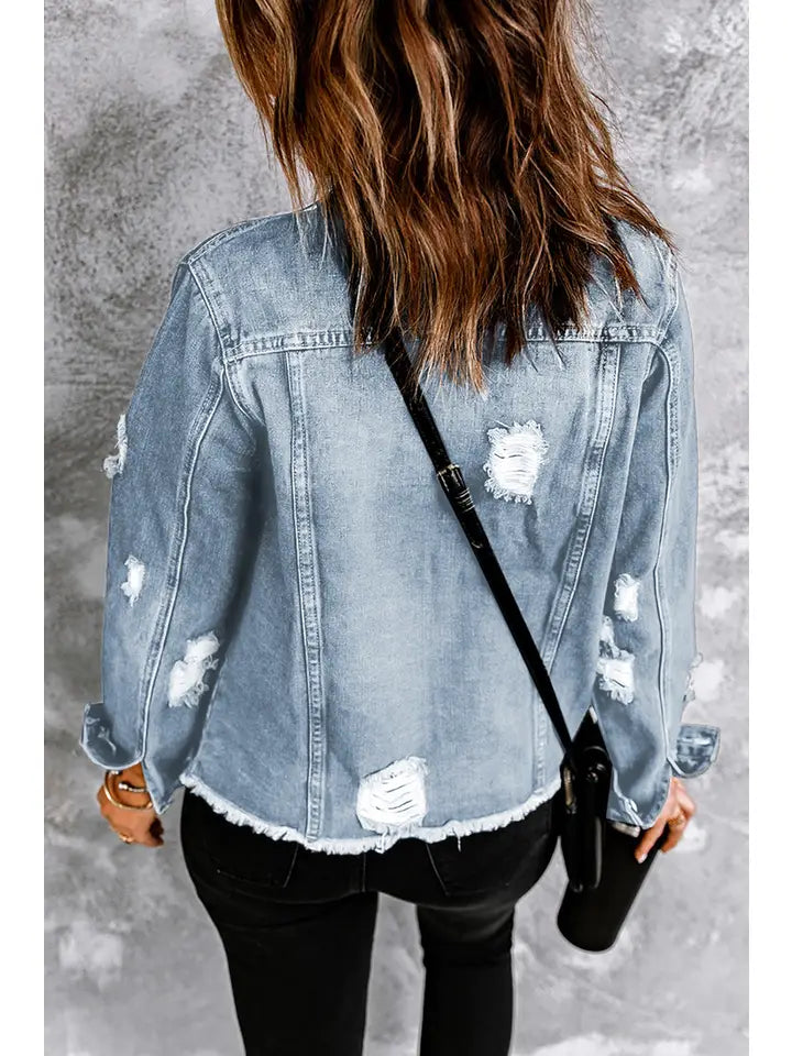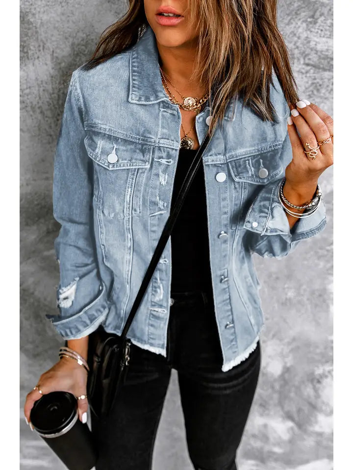 Embrace effortless cool with this statement denim jacket featuring a classic lapel collar, intentionally distressed detailing, and a raw hem that adds contemporary edge. Versatile button-front closure makes layering seamless over any outfit, while the worn-in aesthetic delivers that coveted vintage vibe without compromise. A wardrobe essential that transitions from casual weekends to dressed-up nights with understated sophistication.