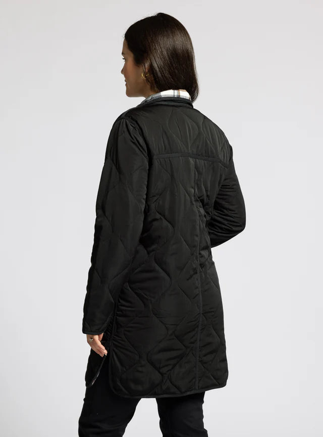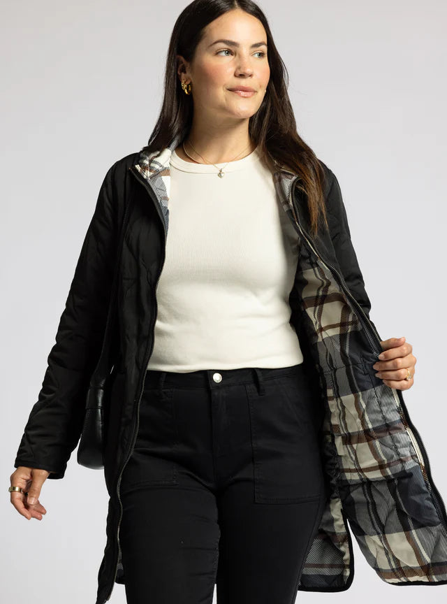 The Nixie Jacket got an upgrade in an all new reversible plaid color-way. This quilted puffer coat is featured with dual side pockets for both ways, zipper front closure and side slits.