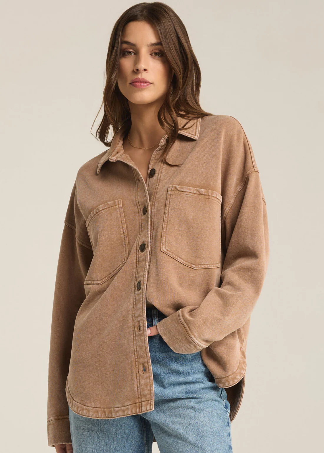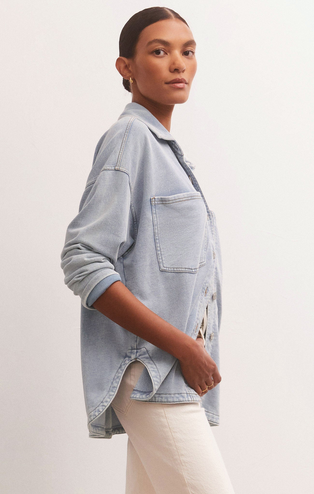 The softer side of denim! The All Day Knit Denim Jacket takes your favorite denim layer and adds an irresistibly soft touch from our Knit Denim French Terry knit fabric. With our special wash, this outerwear layer has that much-loved, worn-in vintage look everyone loves, with a longer, full length, curved hem and updated logo. Oversized patch pockets, and back seam pleat detail are other great features to look out for.