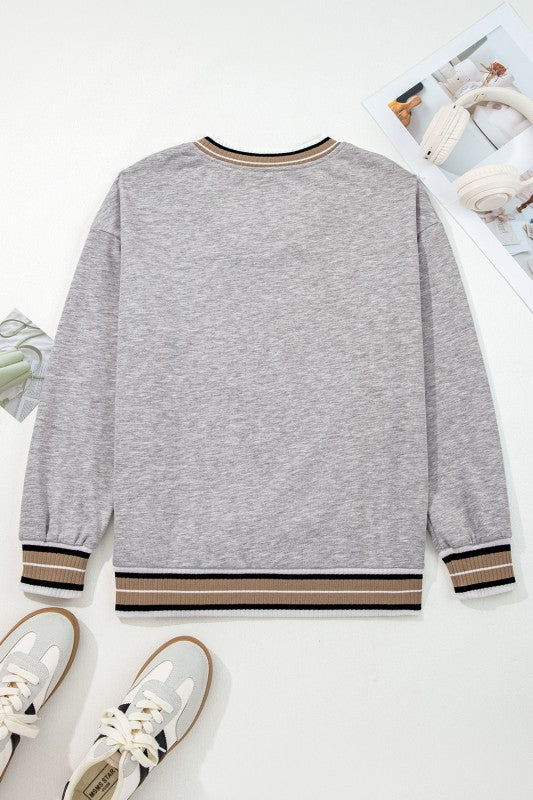 Upgrade your casual wardrobe with this Varsity-Trim Knit Sweatshirt, designed for comfort and style. Made from soft, breathable fabric, it offers a relaxed fit and features bold striped ribbed trim on the V-neck, cuffs, and hem for a sporty, fashionable edge. The versatile heather grey color makes it easy to pair with jeans, leggings, or joggers—ideal for everything from errands to brunch or lounging at home.