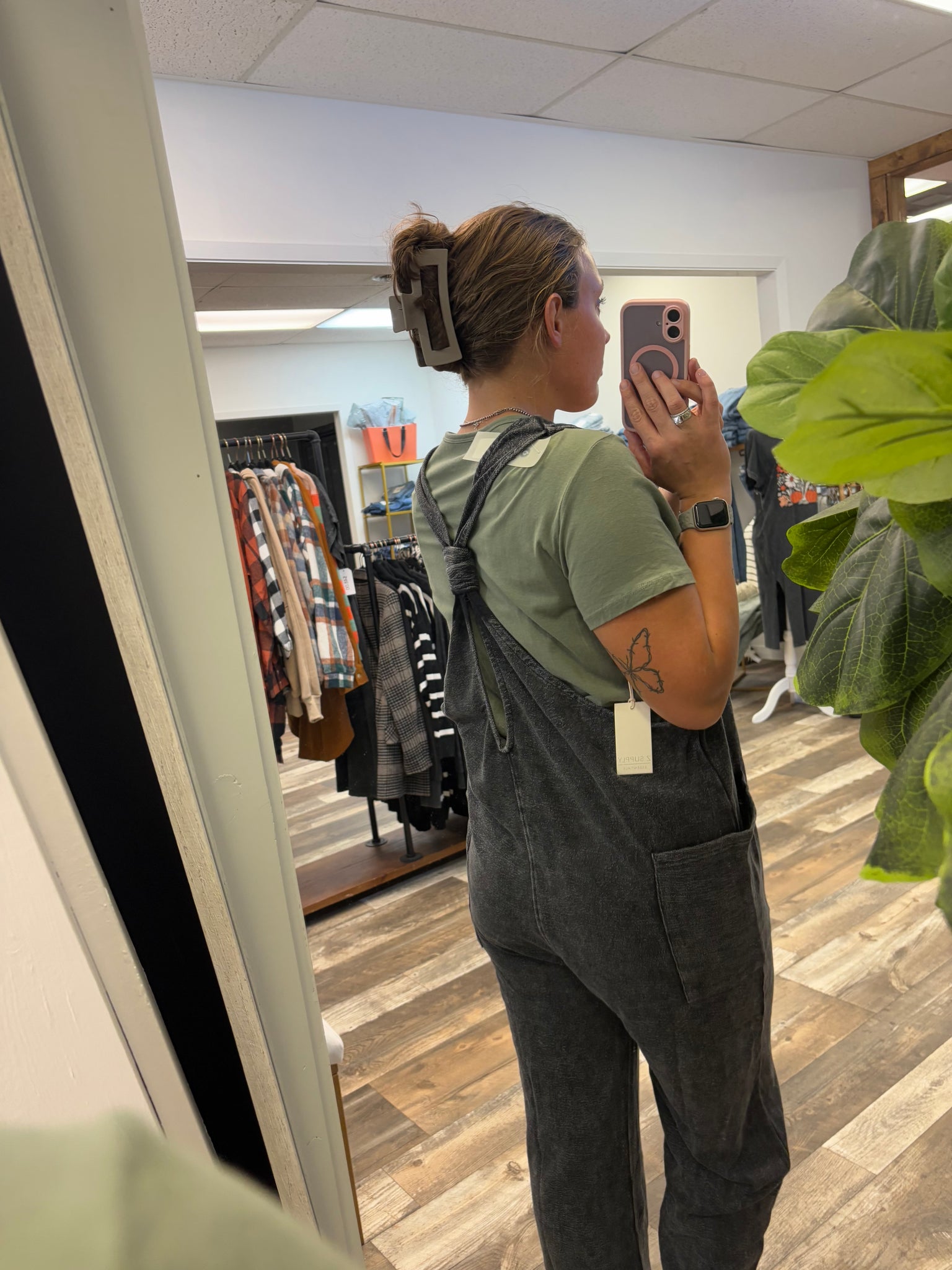 Easy to style for any day of the week. Layer with a denim jacket and sneakers for errands, slip on sandals and a graphic tee underneath for casual outings, or cozy it up with a cardigan for lounging at home. The mineral wash detail makes every jumpsuit unique and gives it a worn in vibe that feels instantly broken in.
