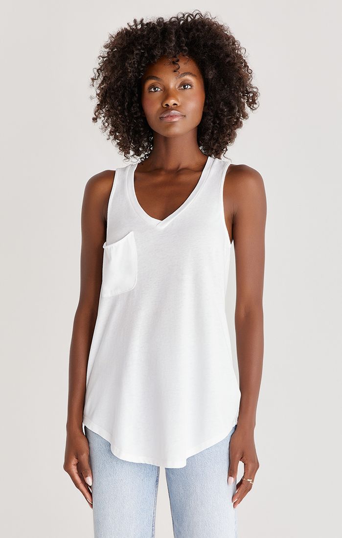 The popular Pocket Racer Tank is here for Summer '22! The soft CVC Jersey fabric makes up this sleeveless tank with a v-neckline, slouchy patch pocket, and rounded hem finish that will keep you cool and looking cute. A staple for any wardrobe. Fabric Content: 60% Cotton 40% Polyester