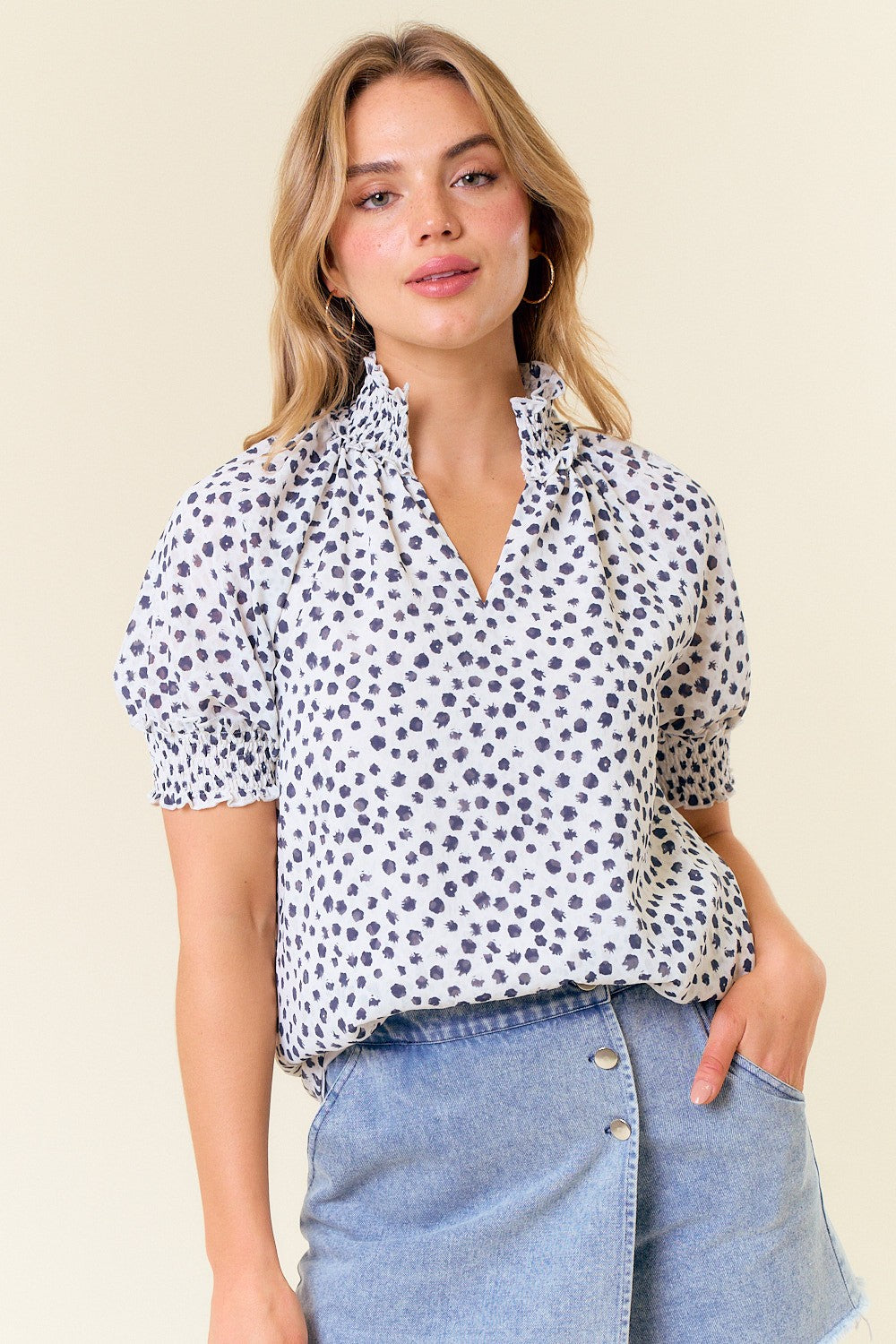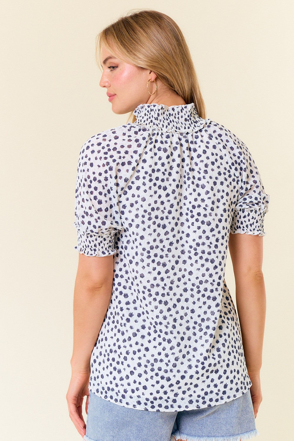 Short-sleeve blouse with jacquard dot print, smocked neck, and puff sleeves