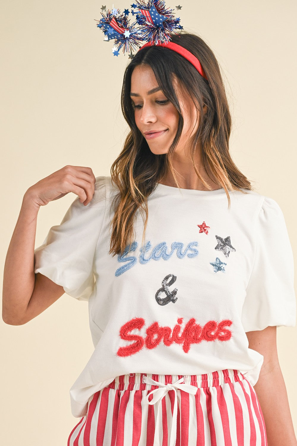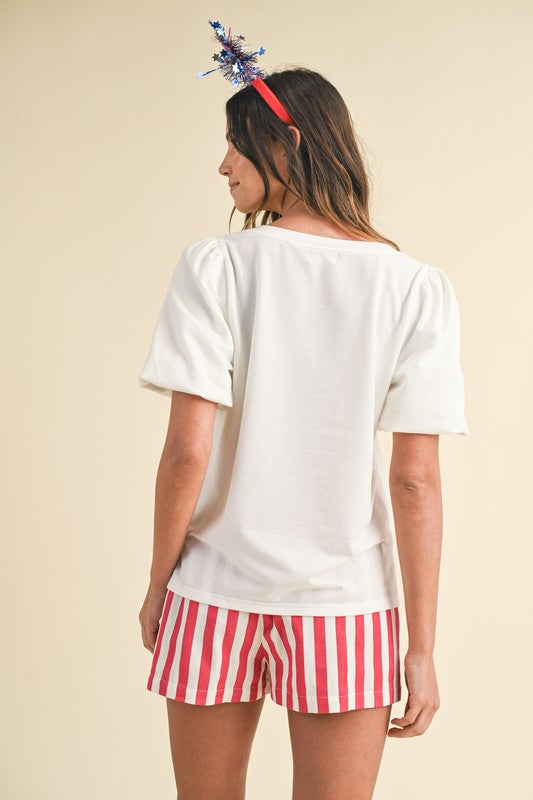 This lightweight French terry knit top features hand-drawn lettering embroidery and charming short bubble sleeves. Designed with a relaxed fit and a classic crew neckline, it combines comfort and style effortlessly. Perfect for adding a unique, artistic touch to your everyday wardrobe.