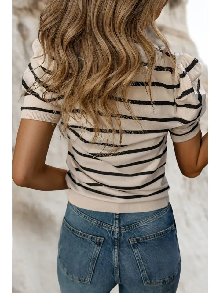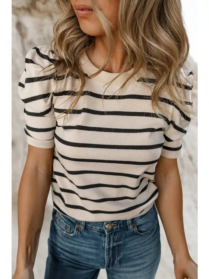 Elevate your wardrobe with this striped top featuring a flattering round neckline and stylish bubble sleeves that add a touch of elegance to any outfit.