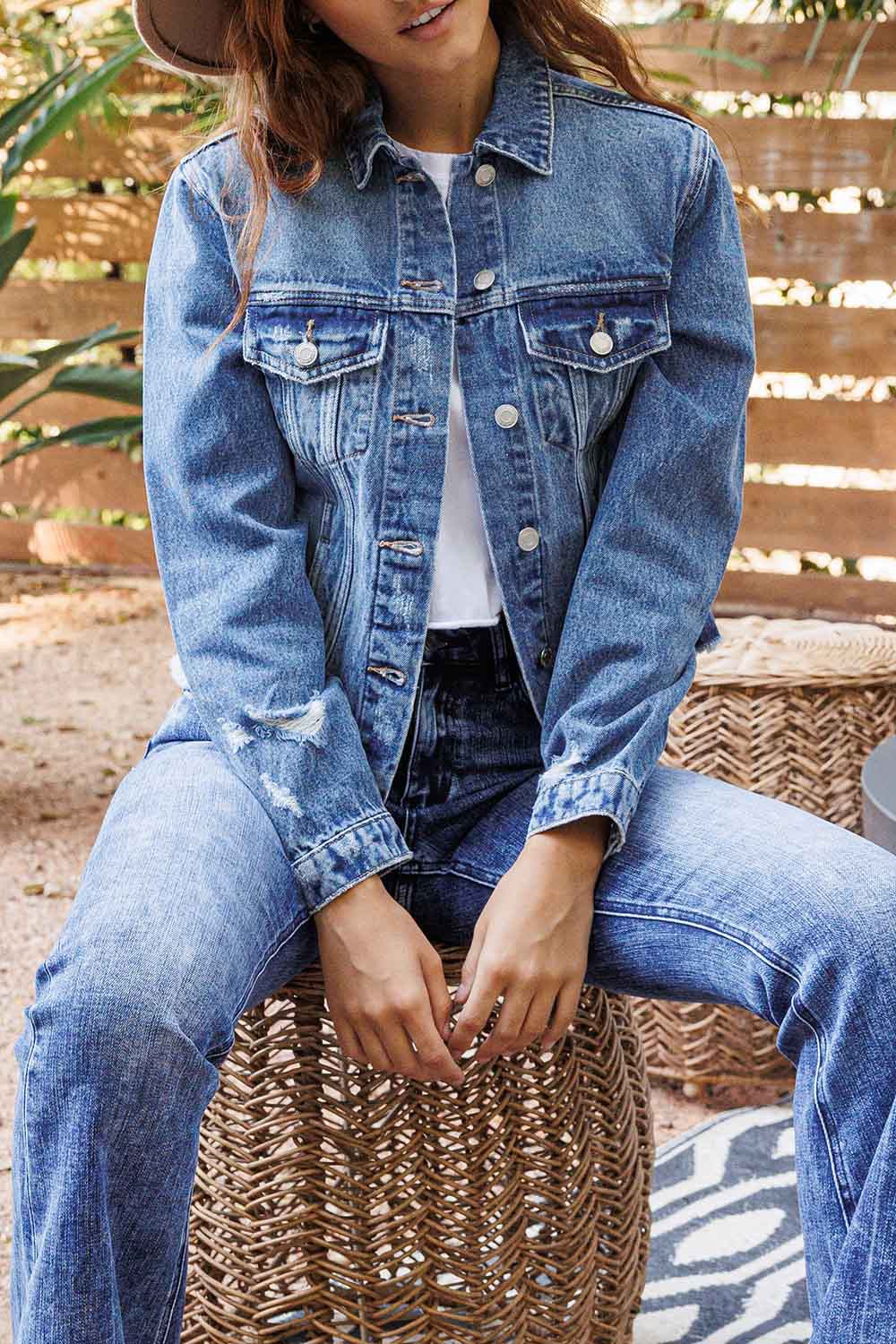 Classic denim jacket with raw hem. Non-stretch denim, distressed detail. Authentic rigid jean texture with single button closure at the cuff.