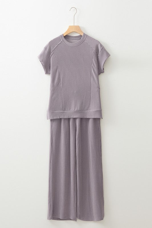 Show off your fashion sense with this set featuring a corded knit short t-shirt and wide leg pants. The solid color provides a sleek and adaptable appearance. Experience the luxurious texture and comfortable fit of the corded knit fabric, ideal for any casual or laid-back occasion. The timeless short sleeve t-shirt can be worn as a standalone piece or paired effortlessly with other clothing items.