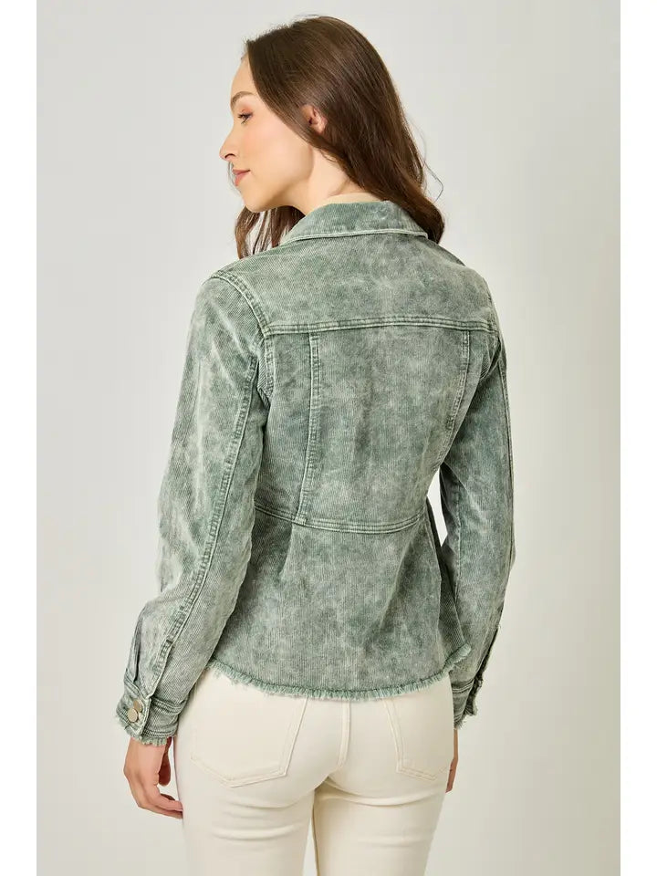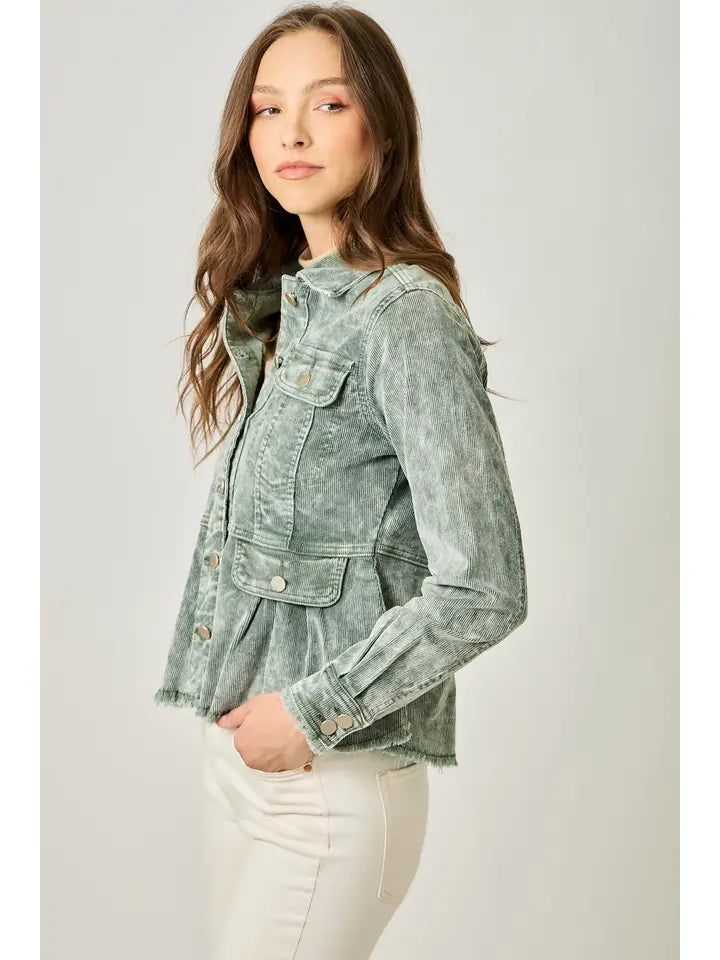Elevate your wardrobe with this washed corduroy peplum jacket, designed to add a flattering silhouette and timeless style to any outfit.