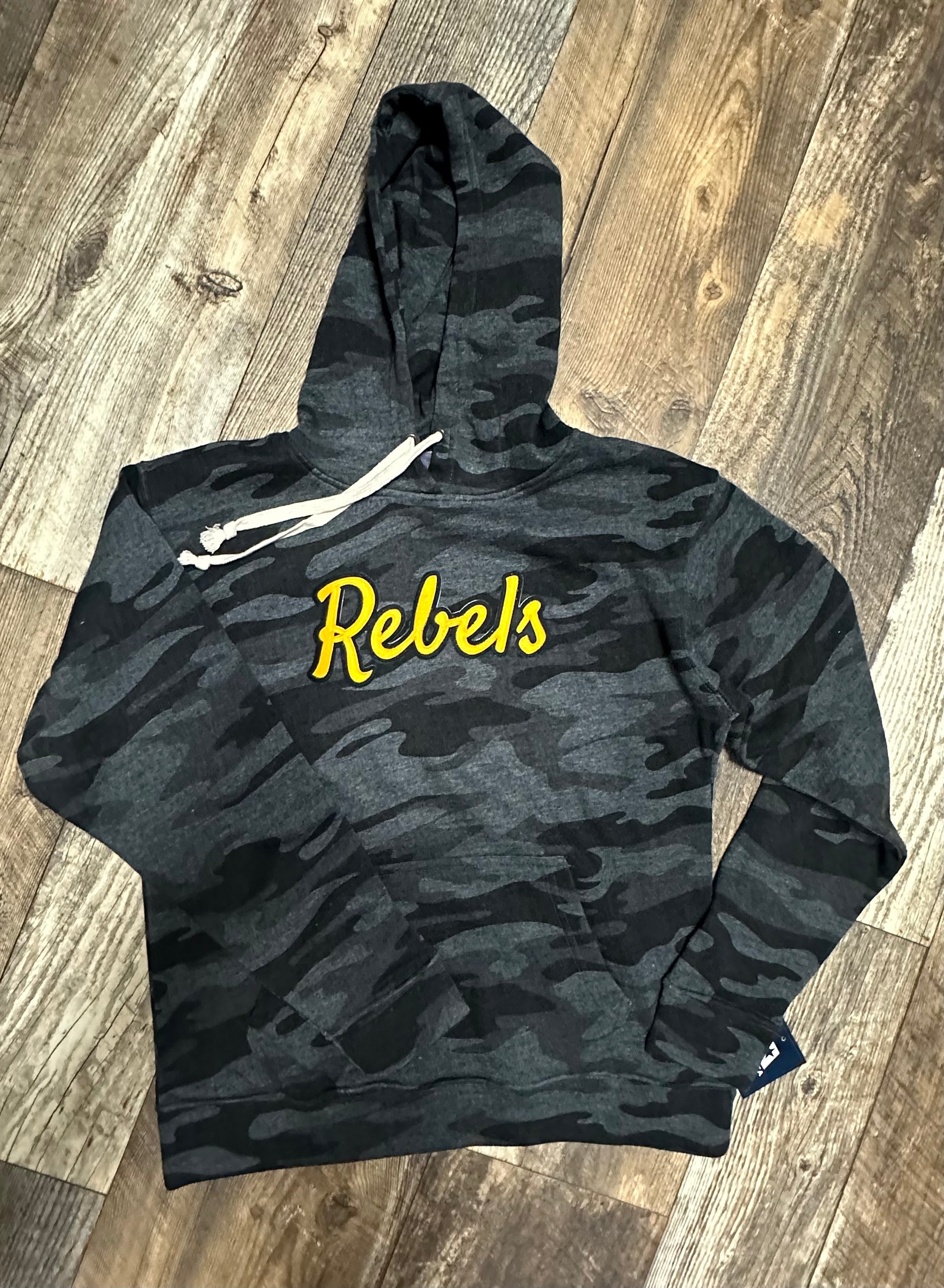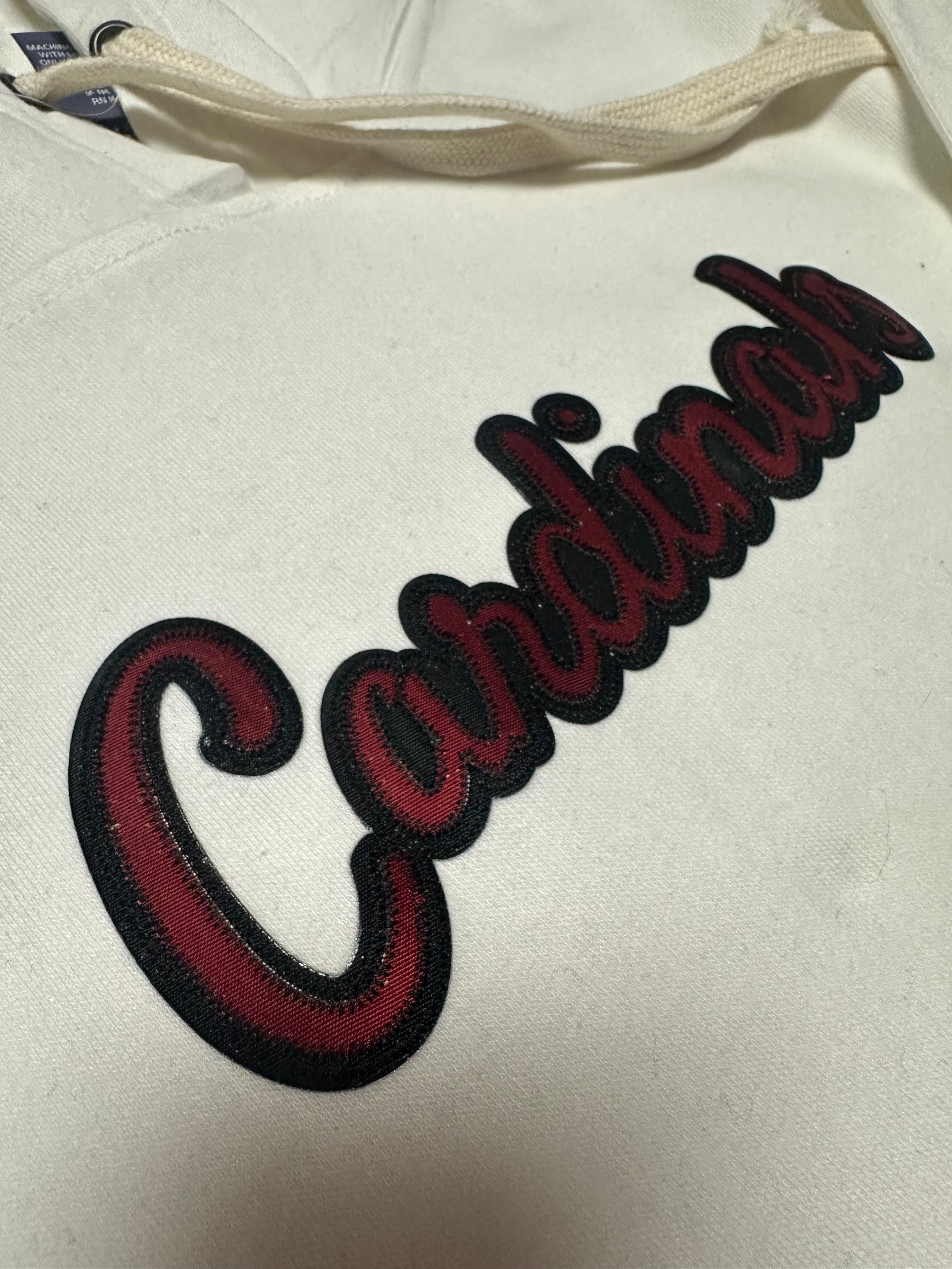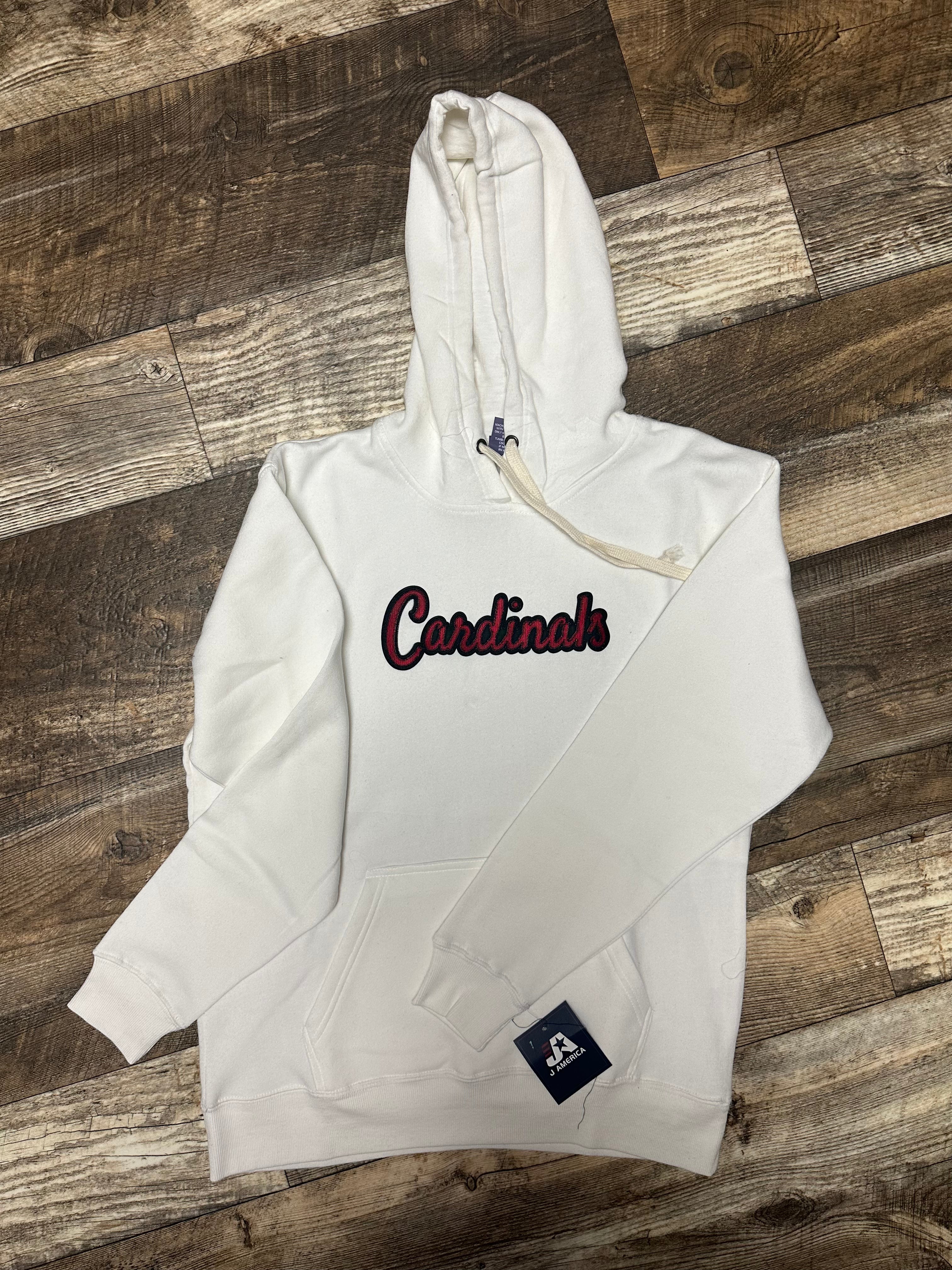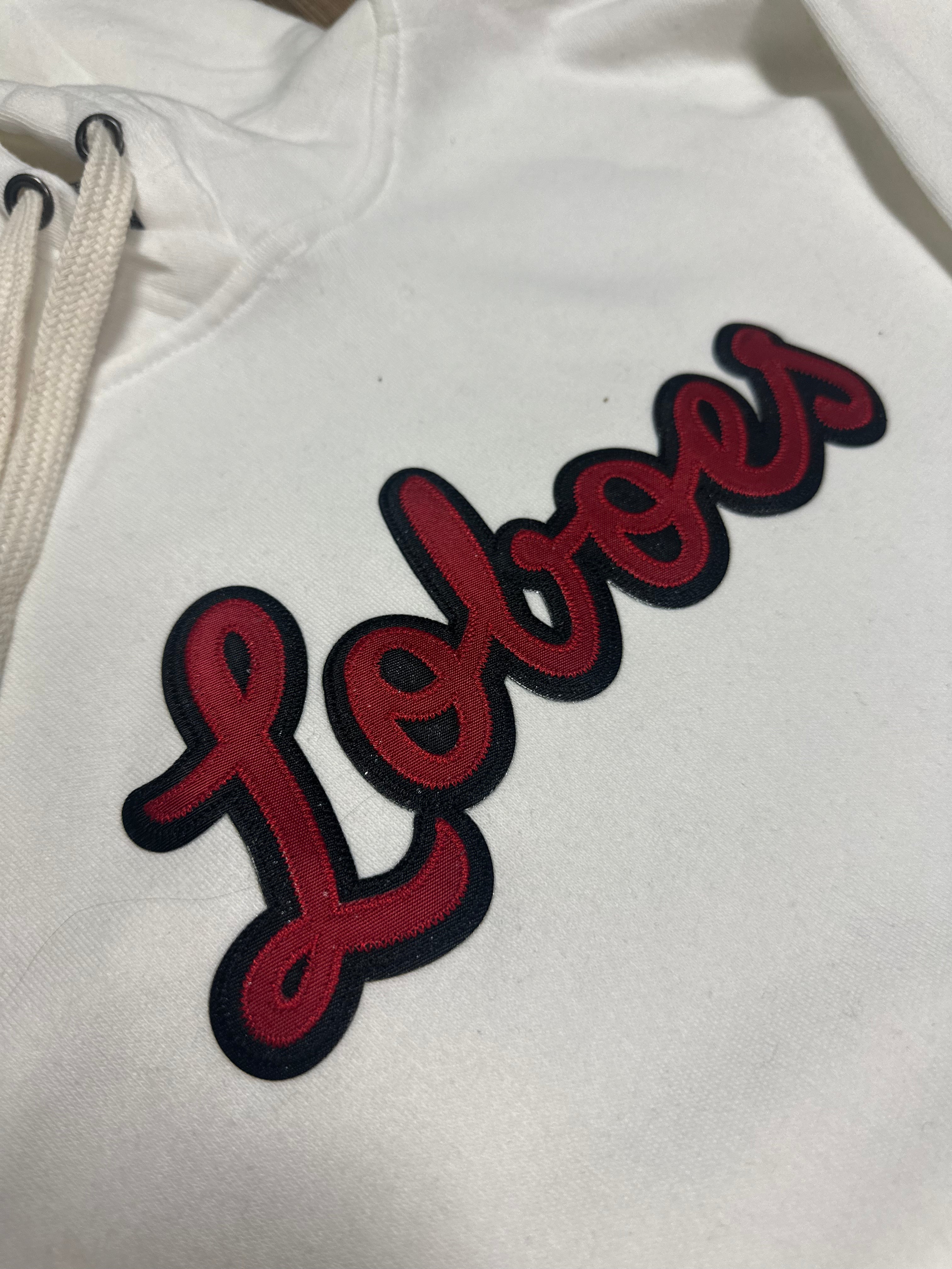 Show your school spirit while staying comfy in this custom designed J. America hoodie. School mascots are applied with a sports-stitch which gives it an embroidered look & feel. All colors are available in all three schools shown, Loboes, Cardinals & Rebels!