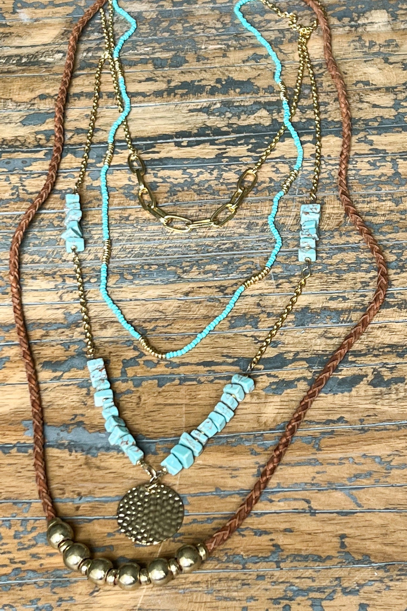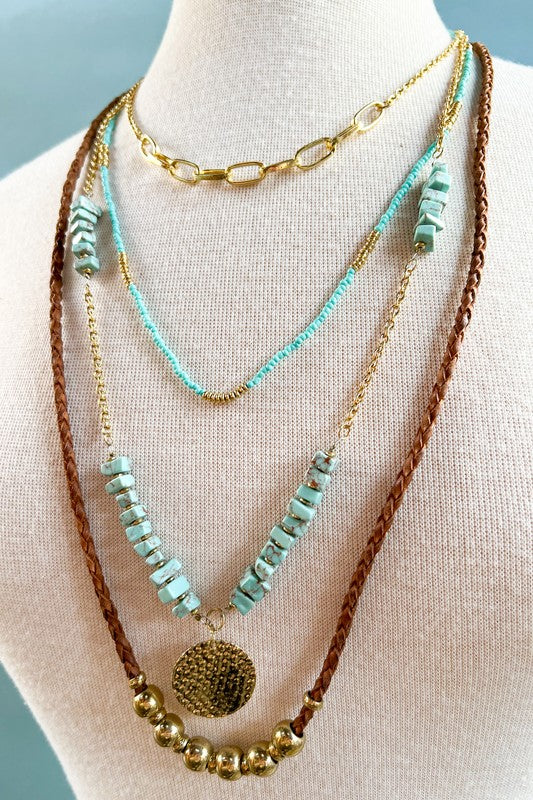 Elevate your style with the Daphne Necklace in turquoise. This non-returnable, four-layer long necklace features a mix of beads, gold chains, and charming gold accents. It secures comfortably with a lobster claw clasp and includes a 2-inch extender for adjustable length. The shortest layer measures 20 inches, making it a versatile accessory for any outfit.