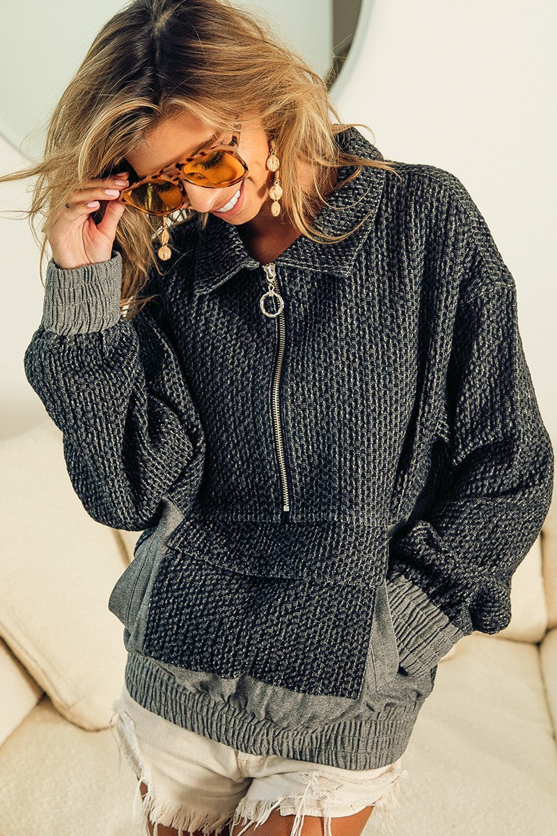 WAFFLE TEXTURED HALF ZIP UP DENIM JACKET WITH POCKETS
