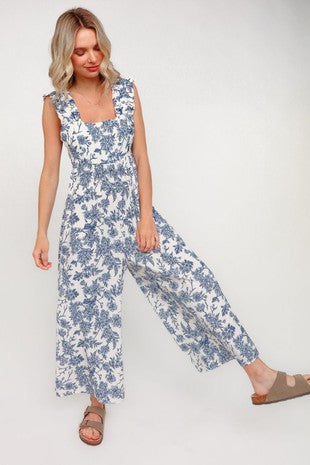 This sleeveless jumpsuit features a frilled shoulder band and an adjustable buttoned tube top for a perfect fit. Its babydoll silhouette flows into wide legs adorned with a charming floral print. The back is accented with a tied bow detail, while convenient side pockets add practicality to this stylish woven piece.