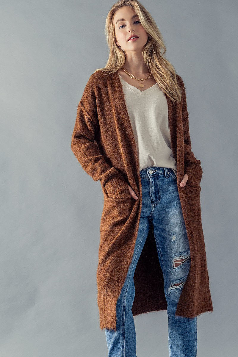 Longline knit fuzzy cardigan with thumbholes to stay extra cozy! It's a timeless piece that'll never go out of style - and keep you comfortable all season long.
