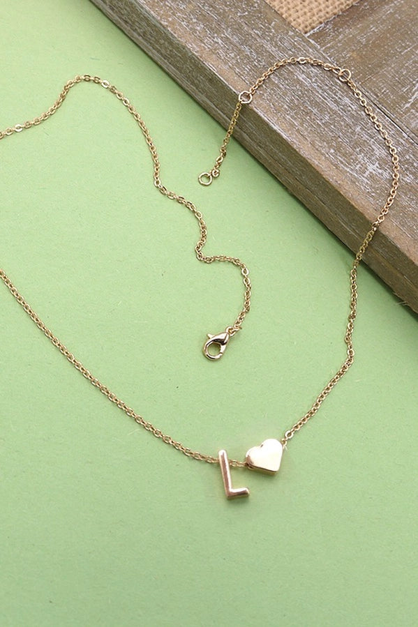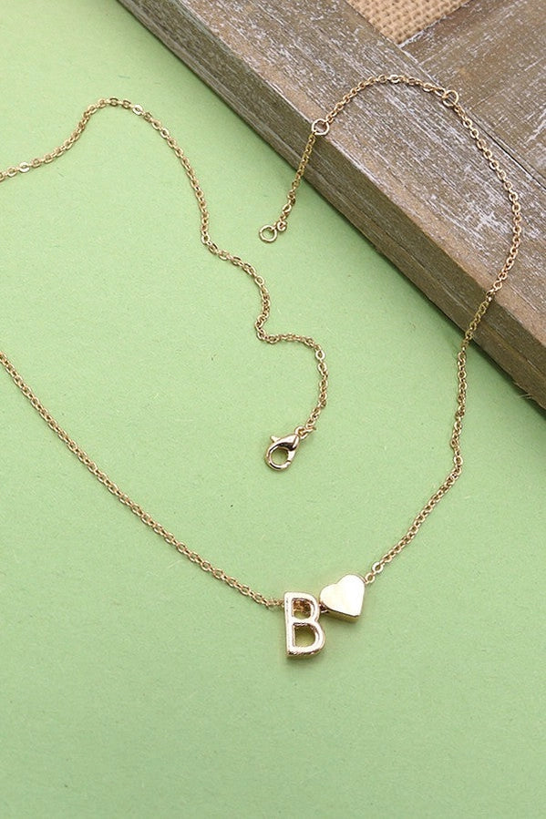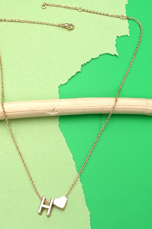 This classic and timeless letter necklace features a dainty uppercase initial and heart charm necklace. Effortlessly chic and dainty. This will look great with your romper or puff hem dress. DIMENSION length: 16" Charm size: .5" x.25" ext: 3" ext clasp: Lobster Claw Metal finish: Gold Plating product: Lead & Nickel Compliant Ant-tarnish: Double E-coating