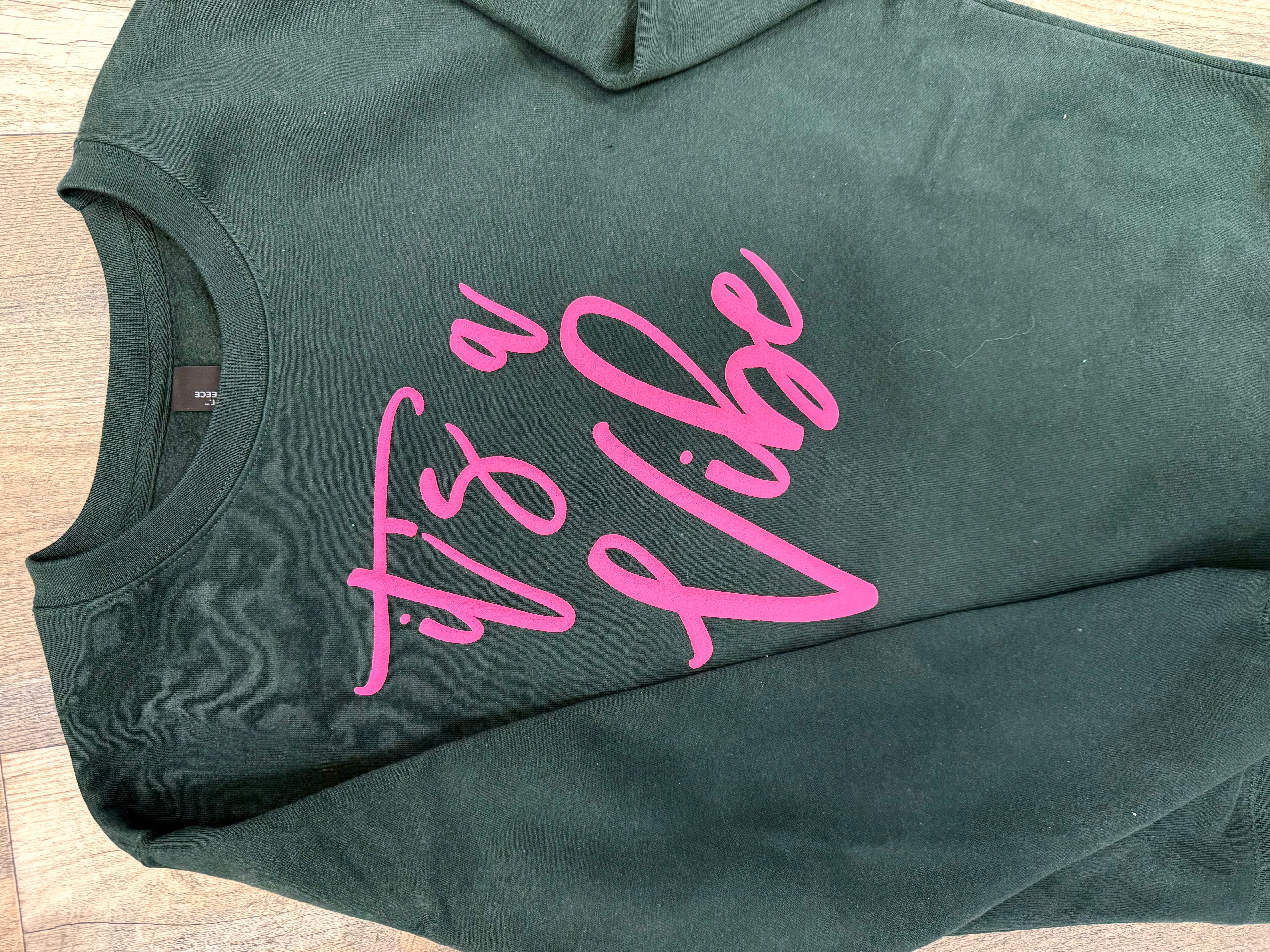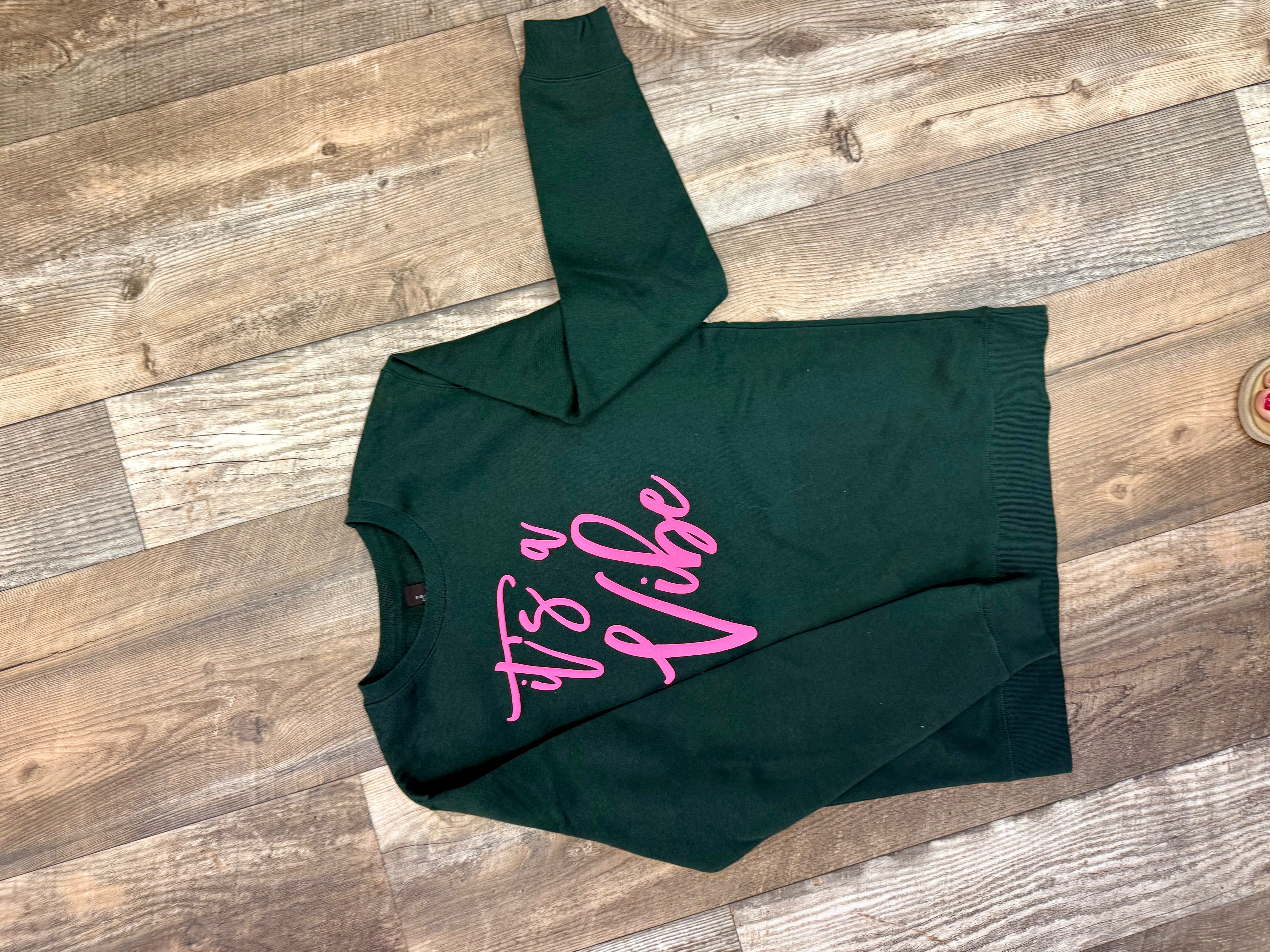 Experience the perfect blend of comfort and style with the It's A Vibe Crewneck. This forest green sweatshirt features a bold hot pink puff print that adds a playful, eye-catching touch to your casual wardrobe. Elevate your everyday wear with a piece that truly captures the mood—because when you wear this, it’s always a vibe.