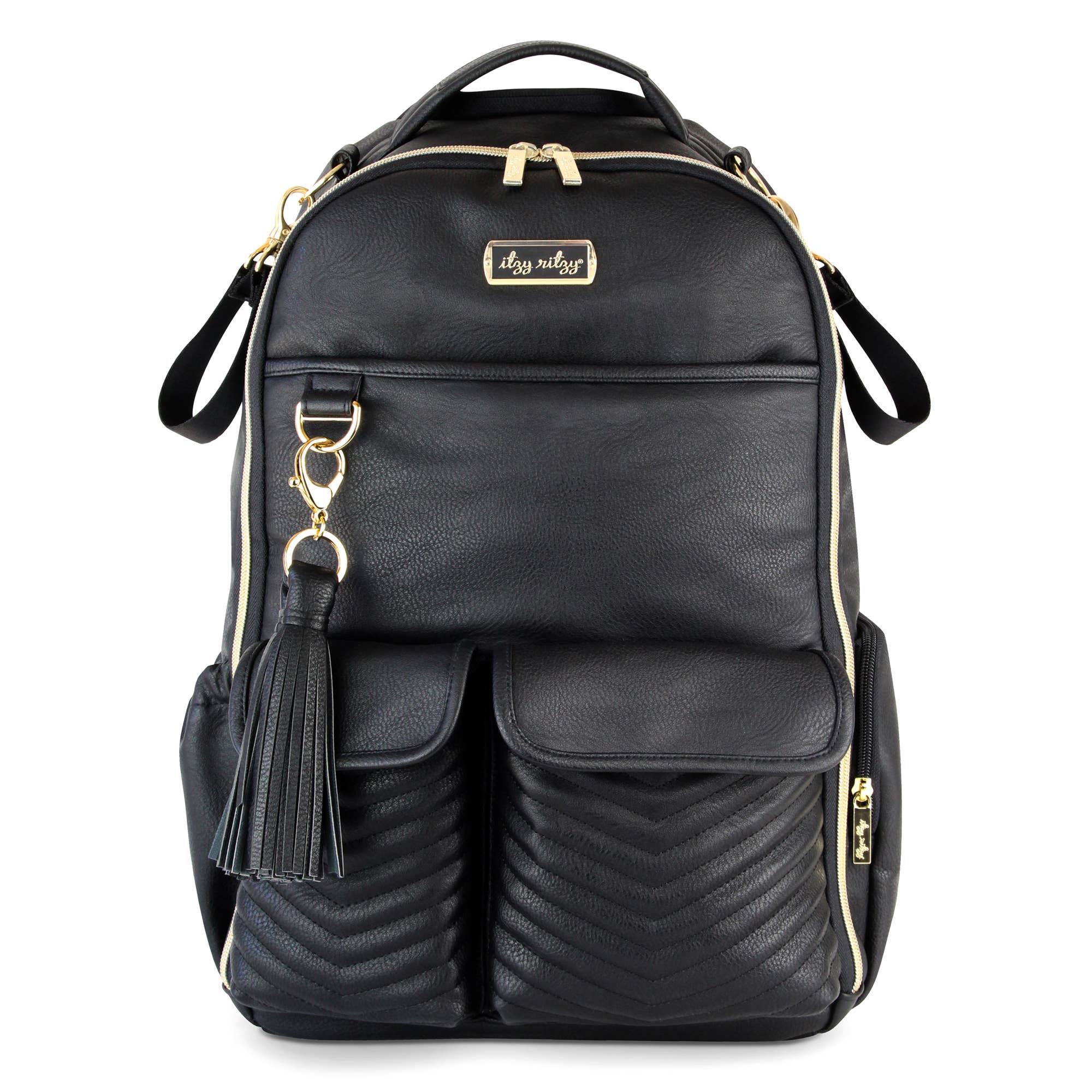 Parenting is an adventure sport so get the right gear. With a roomy interior and easy-access opening, this bag is perfect for the on-the-go parent. Comfortable straps allows for hands-free exploration with little ones. Tons of interior and exterior pockets, 17 total pockets (10 internal and 7 external, including two insulated bottle pockets) and a felt lined valuables pocket to protect contents. Patent pending rubber bag feet to keep the bag upright & clean. Includes coordinating stroller straps, easy wipe changing pad, and 100% vegan leather tassel charm keychain.