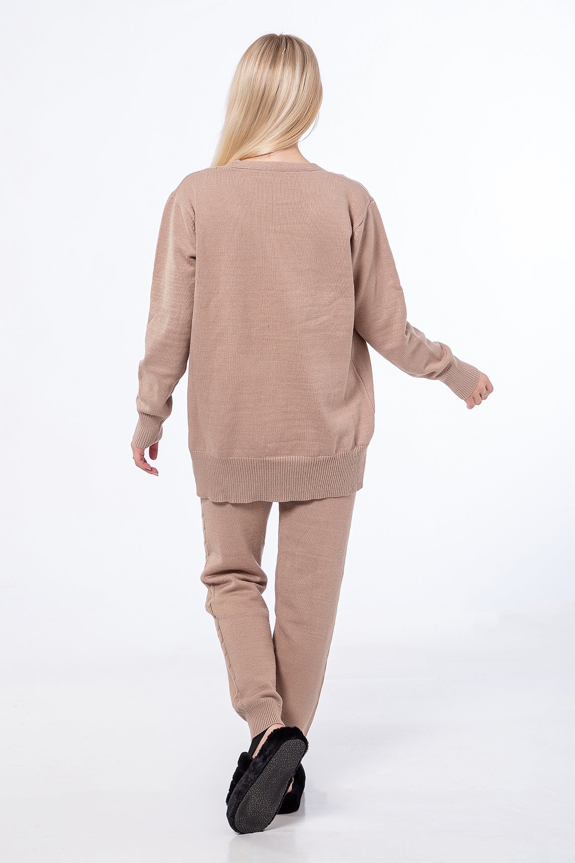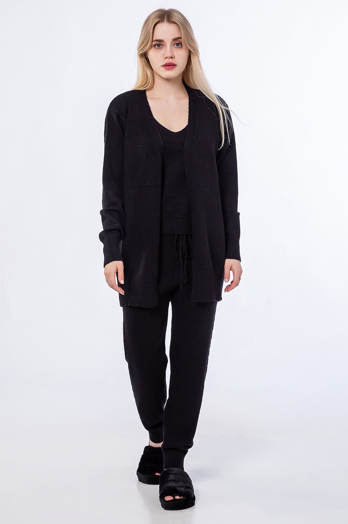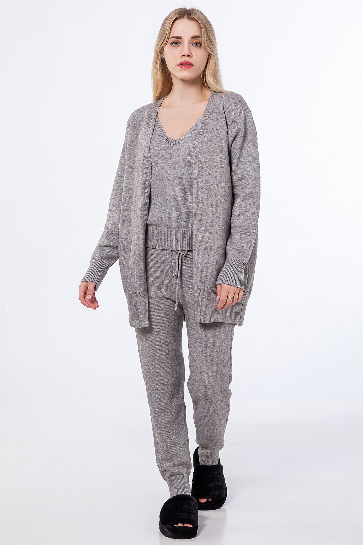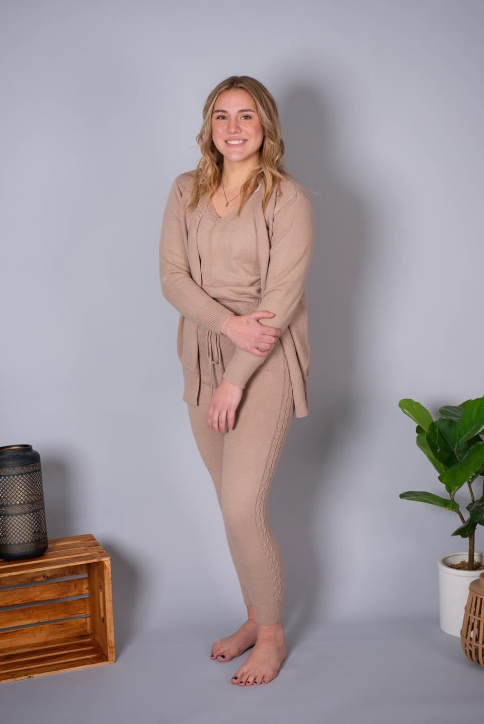 3-piece knitwear lounge set: top, cardigan, and joggers. Soft, thick sweater like knit material.