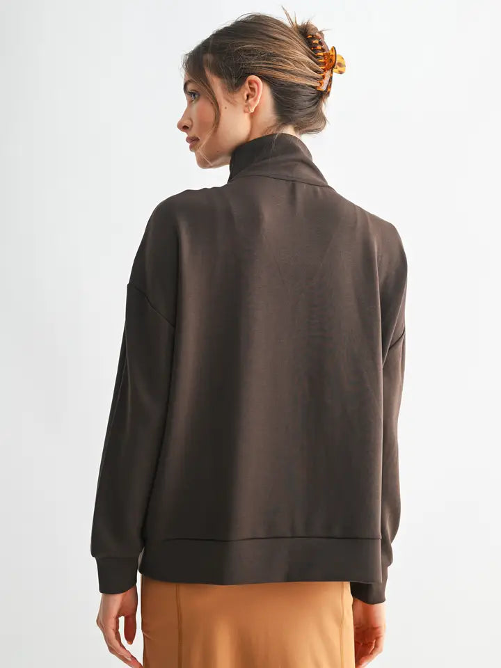 Elevated comfort meets modern style with soft scuba fabric that feels luxurious yet lightweight. A relaxed fit keeps it effortless, while gold trim detailing brings a touch of sophistication. Dropped sleeves and a deep V neckline seamline give it that polished edge, making it the layer you will reach for again and again.