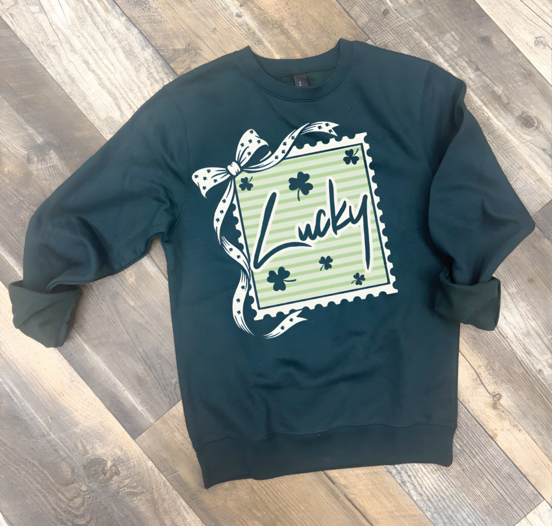 The Lucky Stamp Crewneck is a Ground North exclusive, custom designed and printed in house. This deep green graphic sweatshirt features a vintage inspired stamp design with bold Lucky lettering, shamrock details, and a subtle bow accent that gives it that elevated boutique feel.