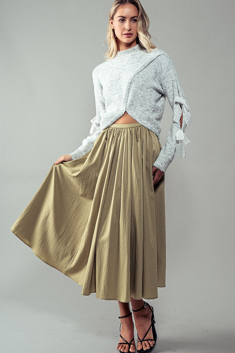 Evelyn Pocket Midi is a perfect blend of style and functionality, featuring a thin circular skirt with convenient pockets on the side and a comfortable elastic waistband, available in sizes S-L.