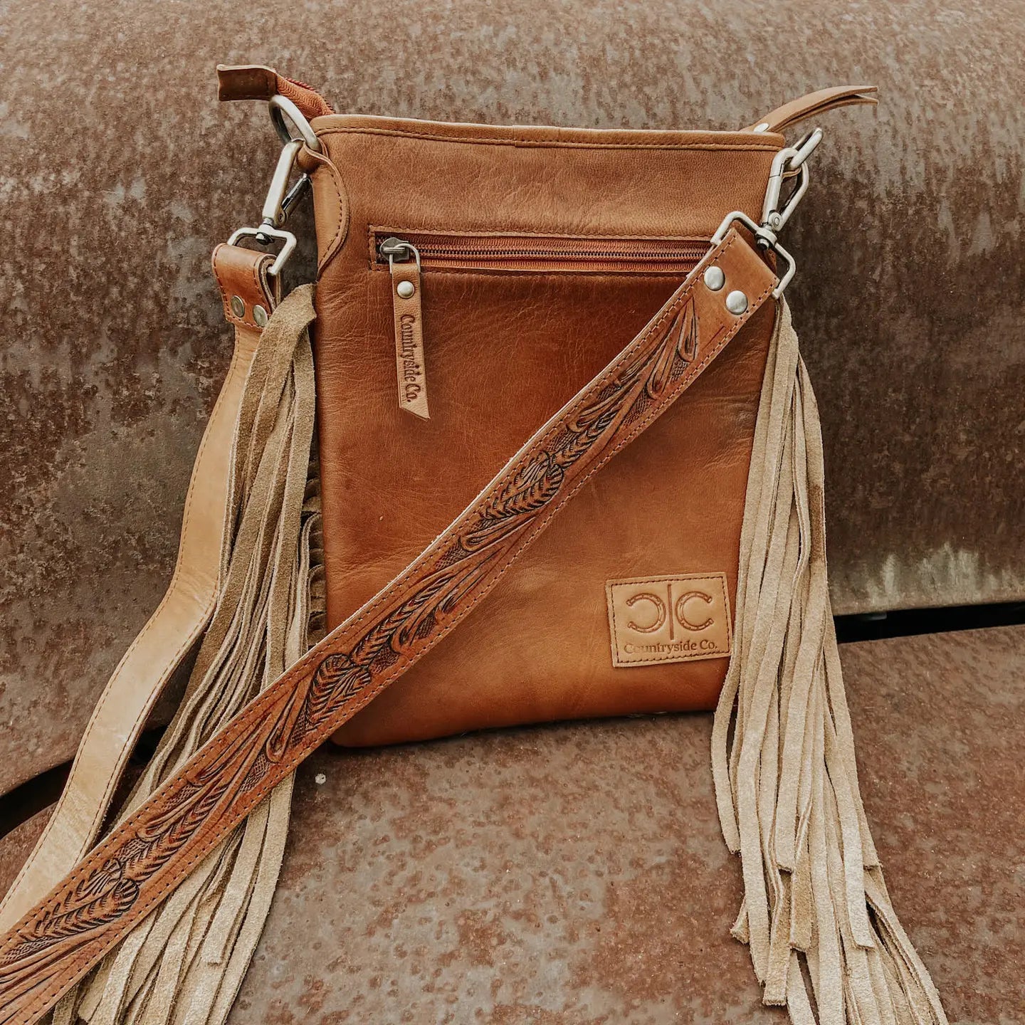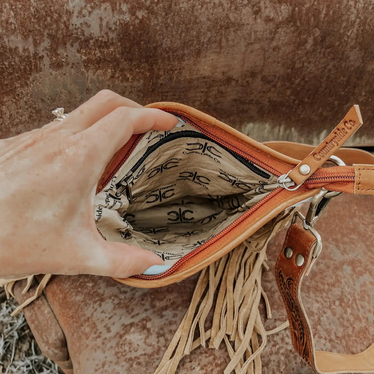 Expertly crafted western purse features a luxurious cowhide checkered front and a leather back for a unique and stylish look. The addition of suede fringe and a tooled leather strap add texture and depth, making it the perfect accessory for any outfit.