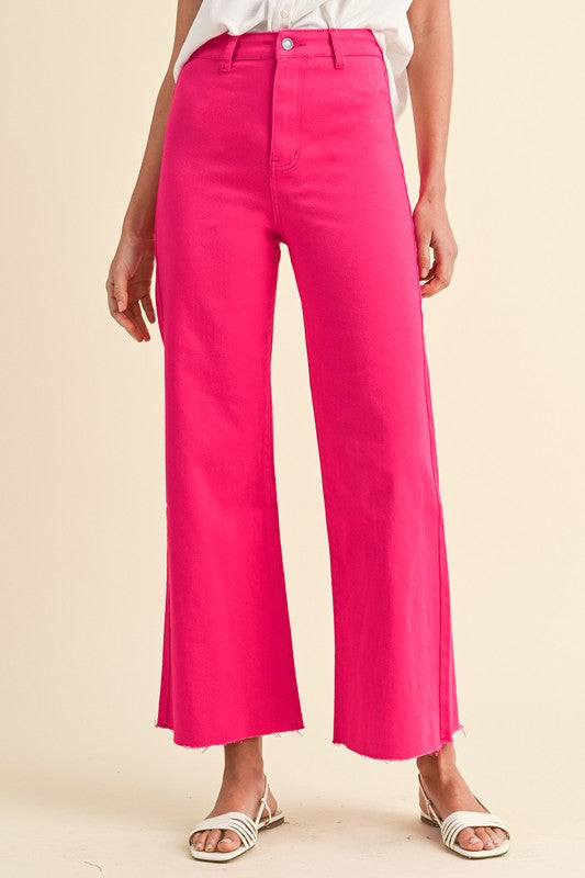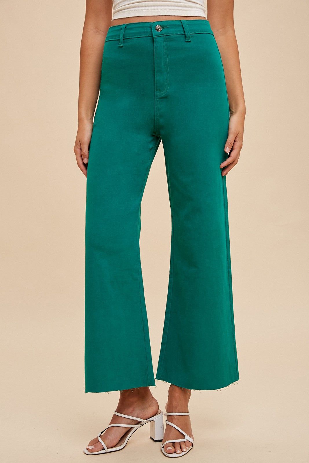These stretch denim jeans feature a high-rise fit with a wide leg and cropped length for a modern silhouette. Designed with only a back pocket and a clean-cut hemline, they offer a sleek, minimalist look without front pockets. Perfect for those seeking comfort and style in one versatile piece.