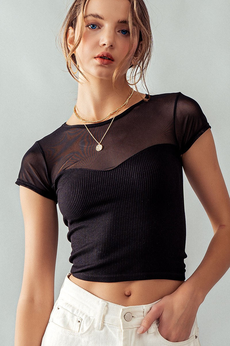 Experience the thrill of adventure in our bold, risk-taking Contrast Mesh Crop Top! Featuring a short sleeve and round neck design with a ribbed bodice, this top will inspire you to push your limits. Made with 95% nylon and 5% spandex, it offers both comfort and flexibility. Available in sizes S-L and made in China. Model is wearing a size small and stands at 5'8". Please note: color may vary slightly due to differences in monitor resolution. Don't miss out on this must-have addition to your wardrobe!