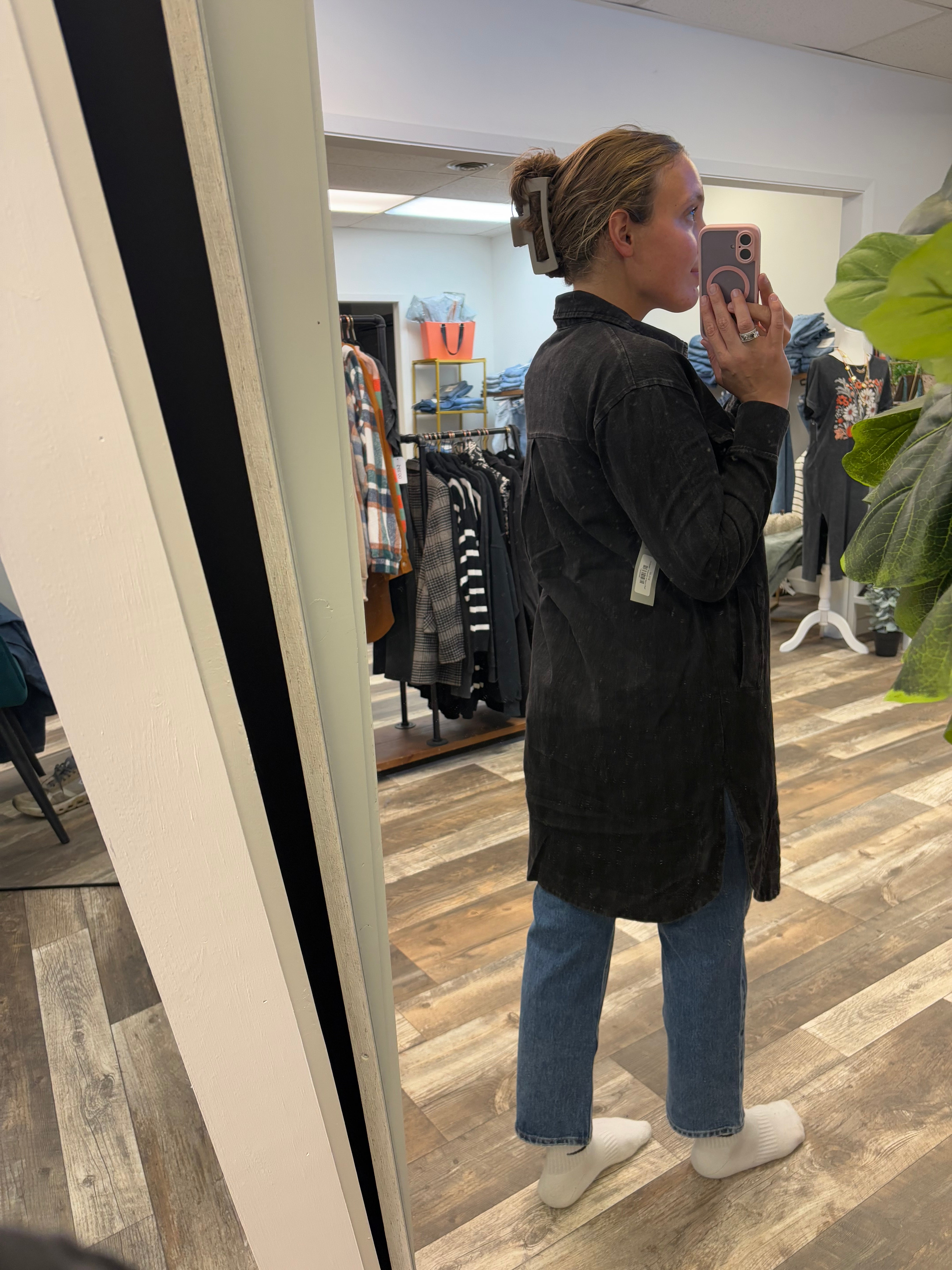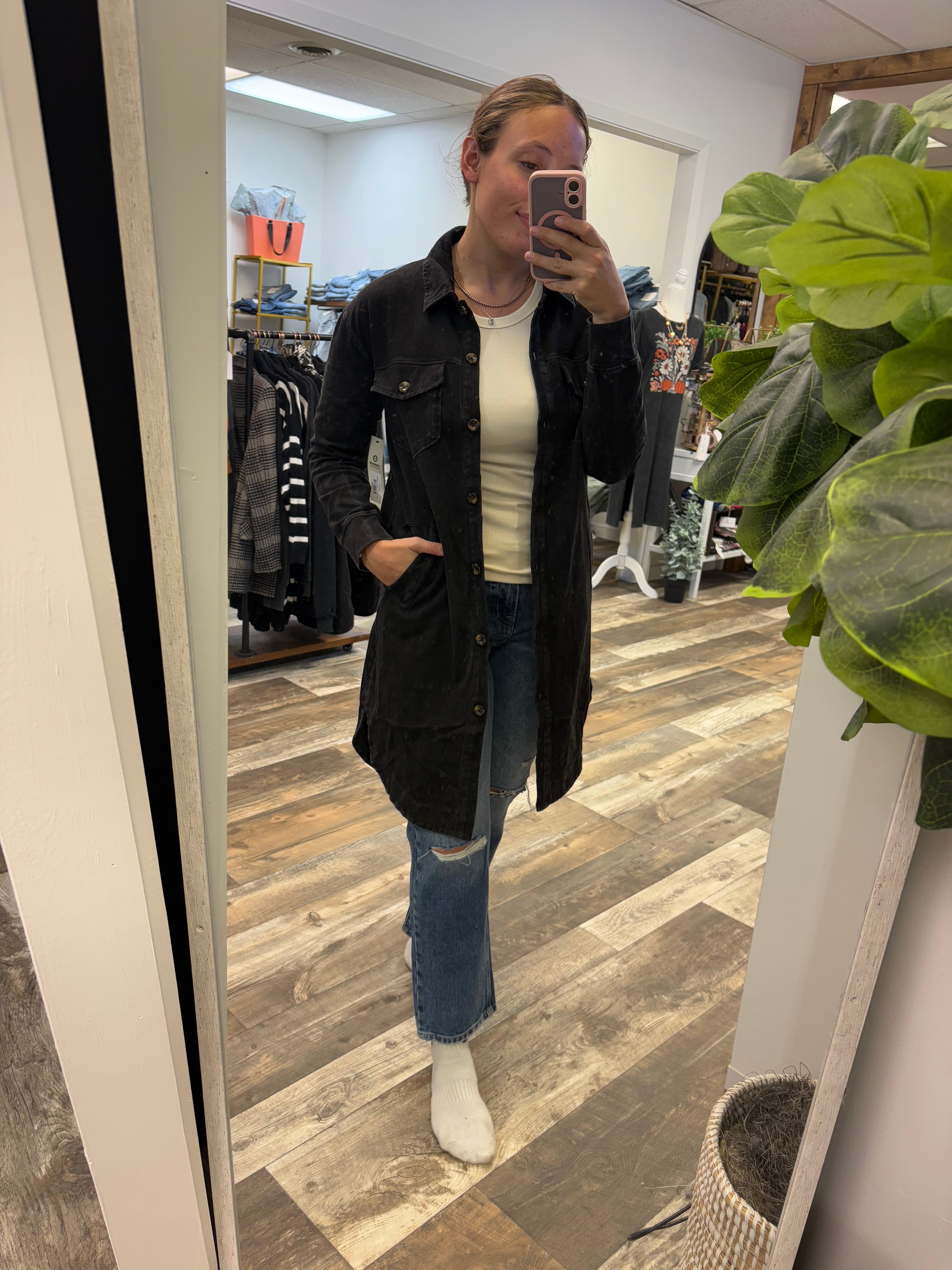 In washed black, this shacket is easy to style for every fall plan, layer it over a cozy crewneck with leggings for the pumpkin patch, throw it on with jeans and boots for Friday night lights, or pair it with a scarf and your go to sneakers for a coffee run. Lightweight yet warm, it’s the perfect grab and go jacket as the temps drop.